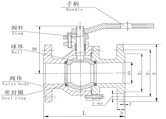 The valve is composed of valve body, ball, valve stem, packing gland, limit plate, handle and other parts. The handle parallel to the pipeline axis indicates that the valve is in the open position, and perpendicular to the pipeline axis indicates that the valve is in the closed position. The opening and closing can be realized by turning the handle 90 °